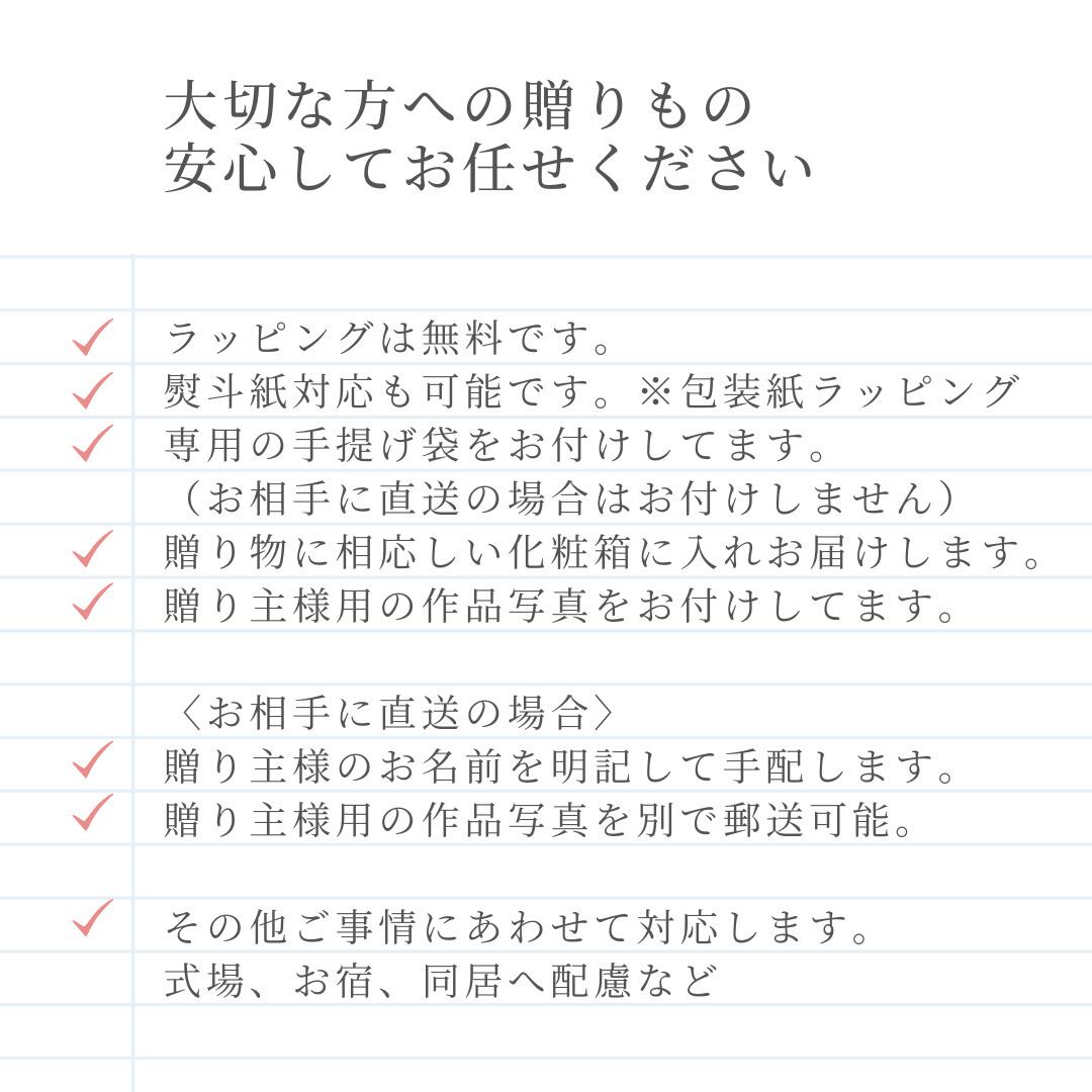 ・お相手への直送ギフトの場合手提げ袋付きませんが、明細書や完成品写真をご注文者様宛に別で郵送させていただきます。