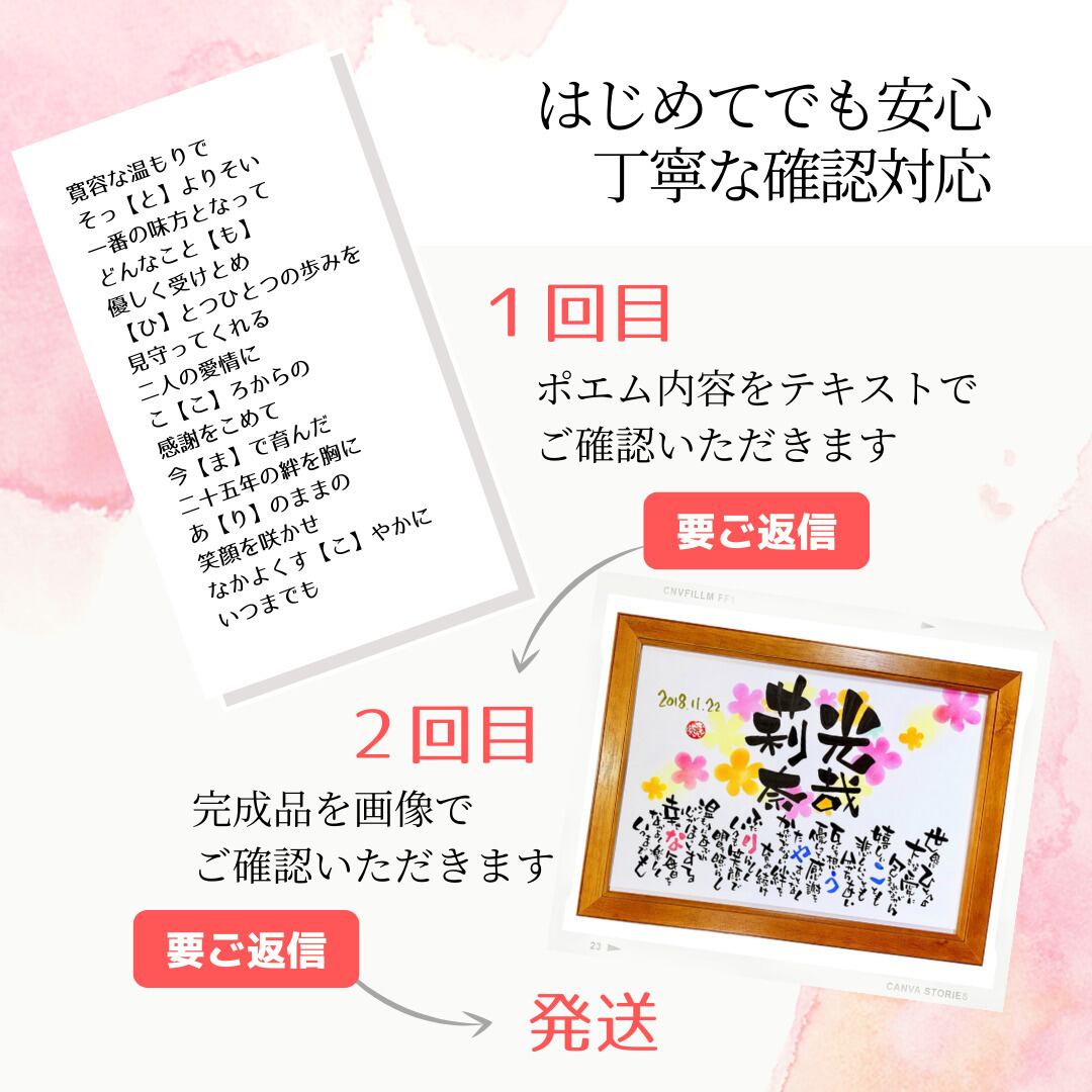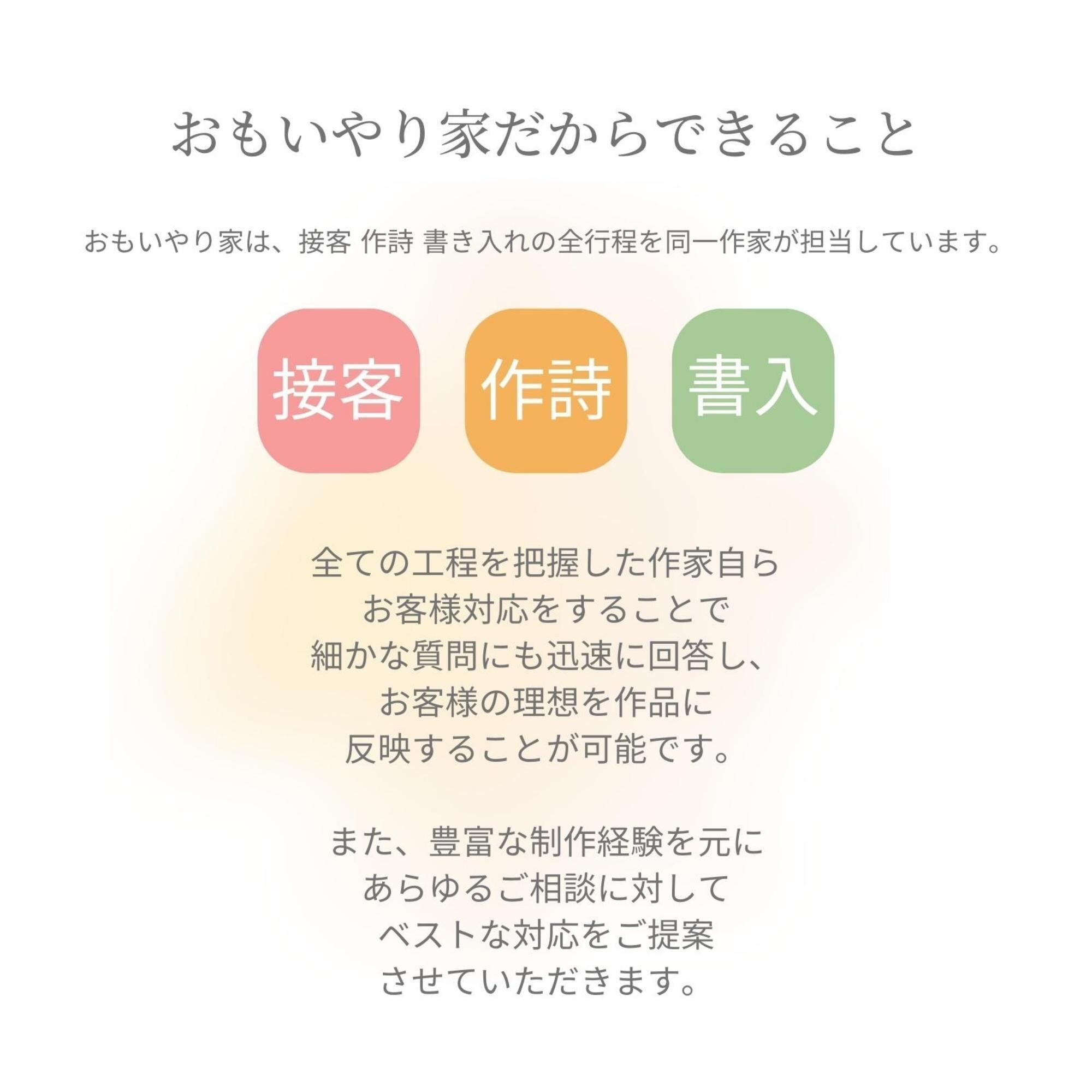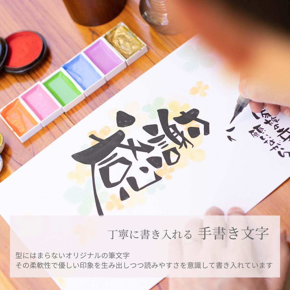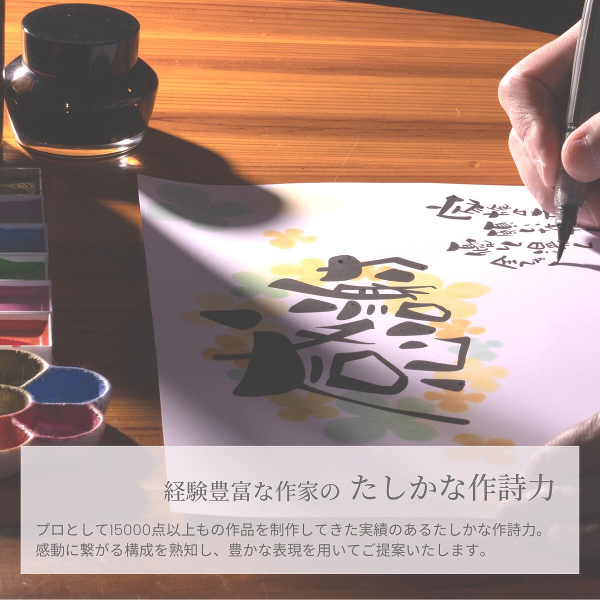 オーダーメイドで作る世界にひとつだけの贈りものとして経験豊富なプロの作家があなたの想いを受けとめて作詩し、味わいのある独自の字体で書き入れます。